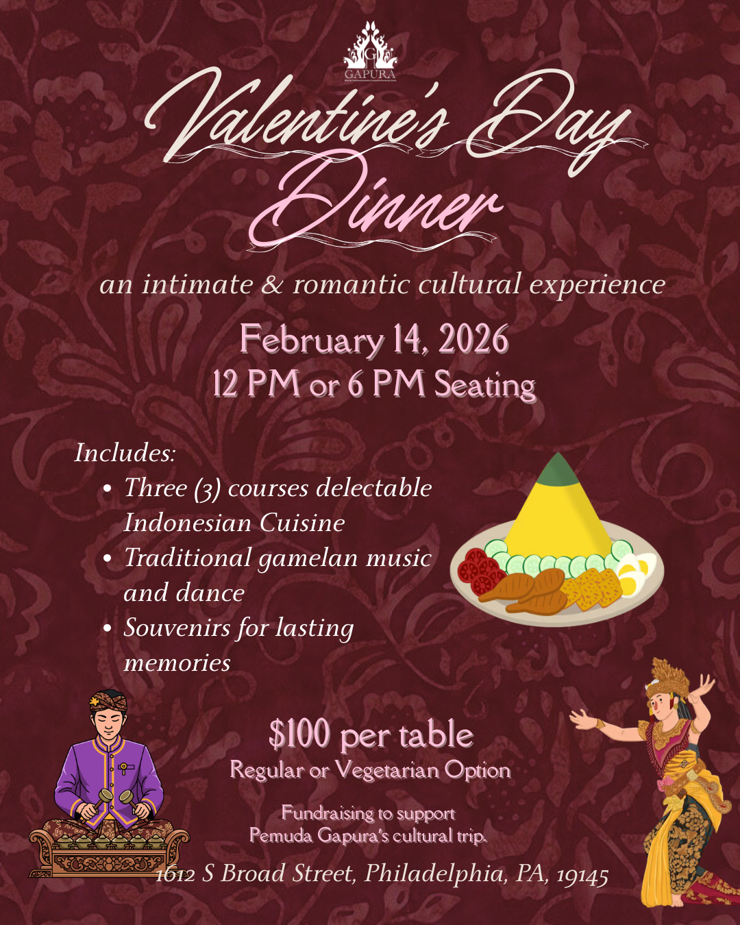 Valentine's Day Dining Experience is an intimate, cultural experience that combines dinner and a show for a perfect night out while also contributing to a great cause. Enjoy a delectable 3 course Indonesian meal while watching captivating Indonesian dance performances along with some tunes from our very own Gamelan Gita Santi. Included in your experience is a polaroid and love letter keepsake so you can remember this night forever. This is fundraiser for our youth from Gamelan Gita Santi to learn gamelan & dance in Bali, Indonesia. This trip serves not only as an educational opportunity but as a cultural bridge for the youth who want to build that relationship. With your support, we can send our dedicated learners to embrace their heritage and ancestry.